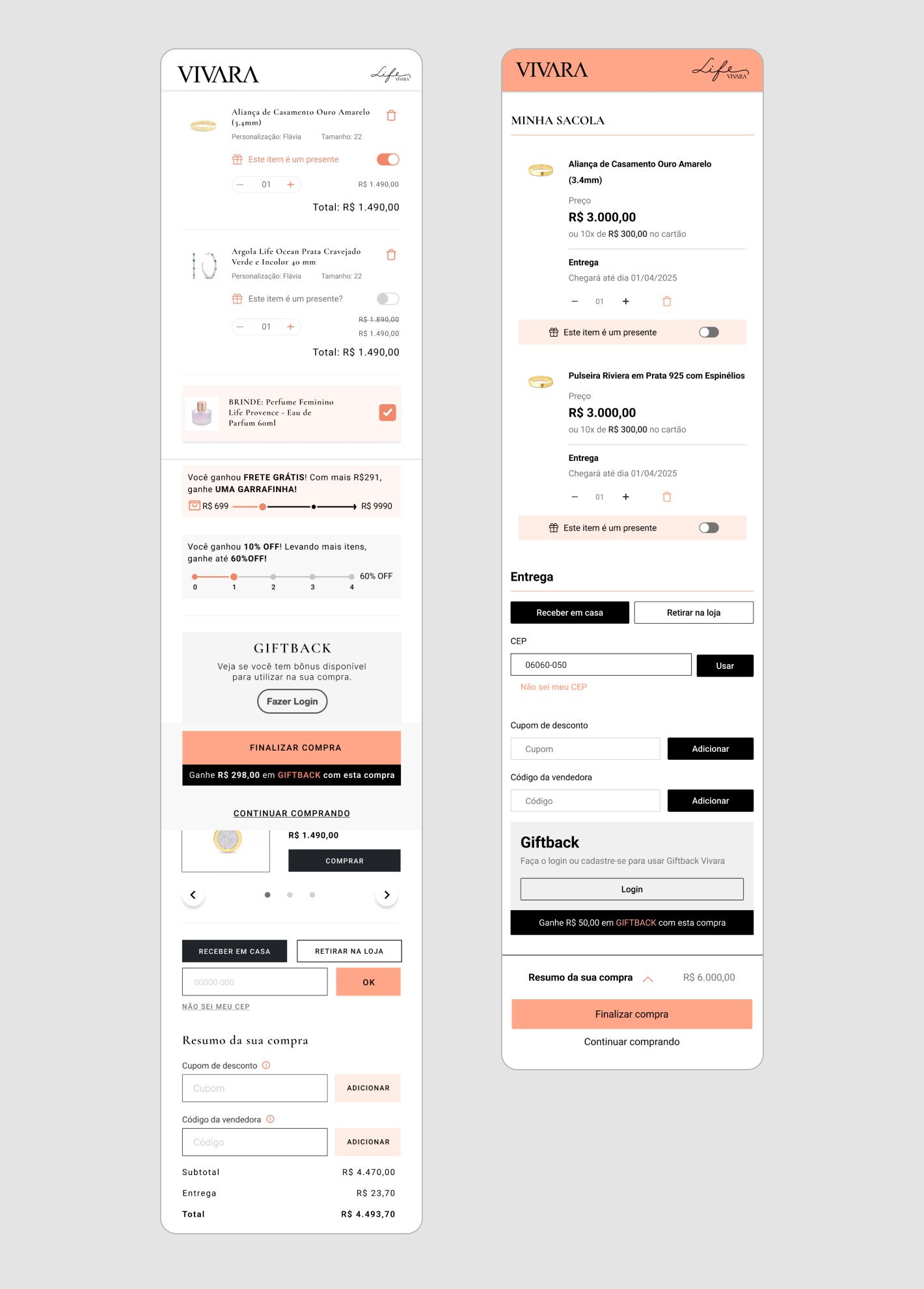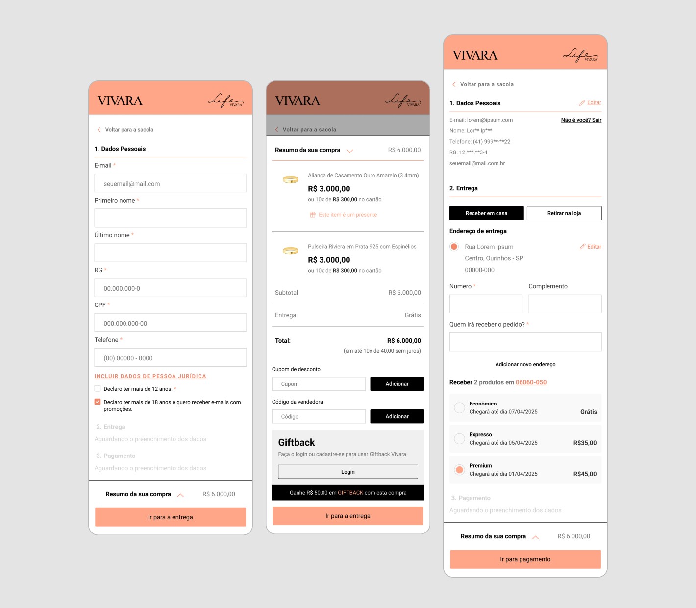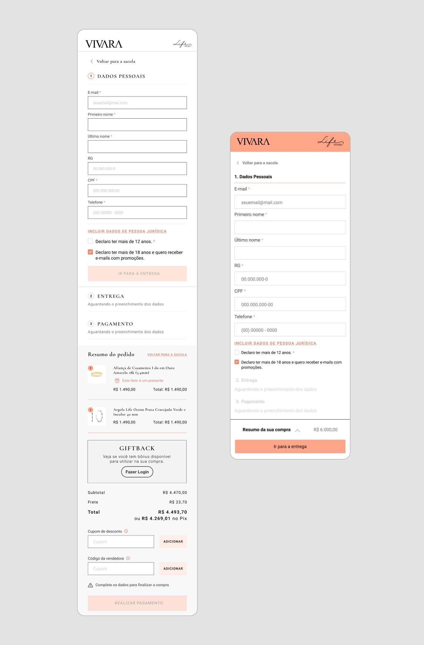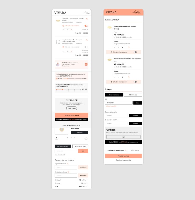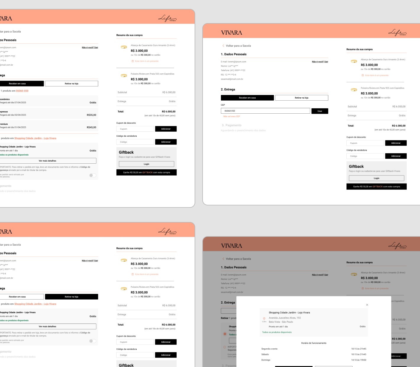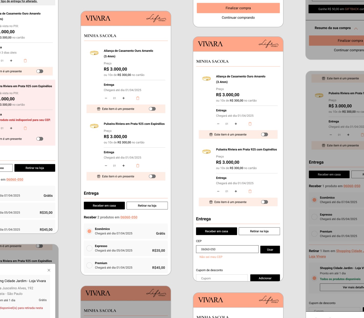 The previous checkout experience on Vivara’s website presented several usability challenges. The typography was difficult to read, the product details were unclear, and the purchase steps lacked visual hierarchy. As a result, users often felt uncertain during checkout, increasing friction and abandonment rates.